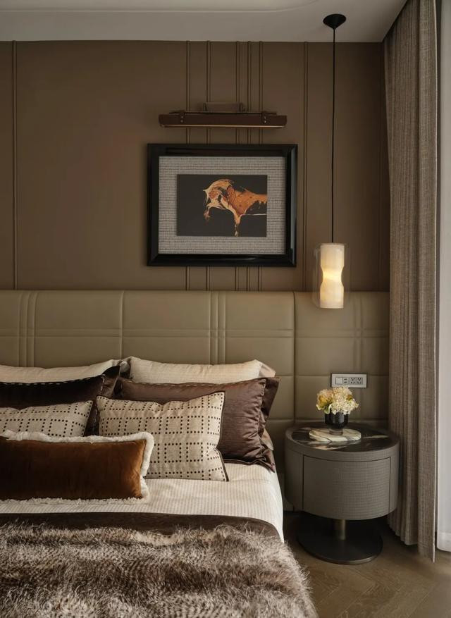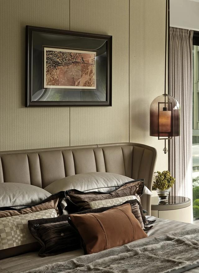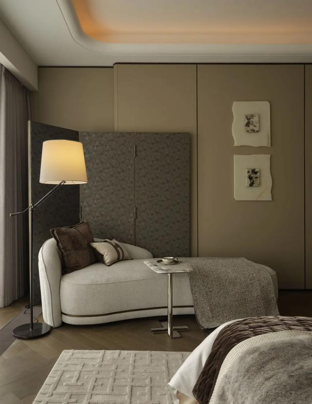 主卧平衡功能与仪式感,重构私密本真。器物隐于光影,触之即感真皮温润、织物细密与秩序美学,生活如自然舒展,漫溢隐而不彰的奢华从容。
