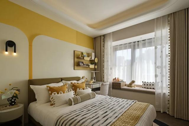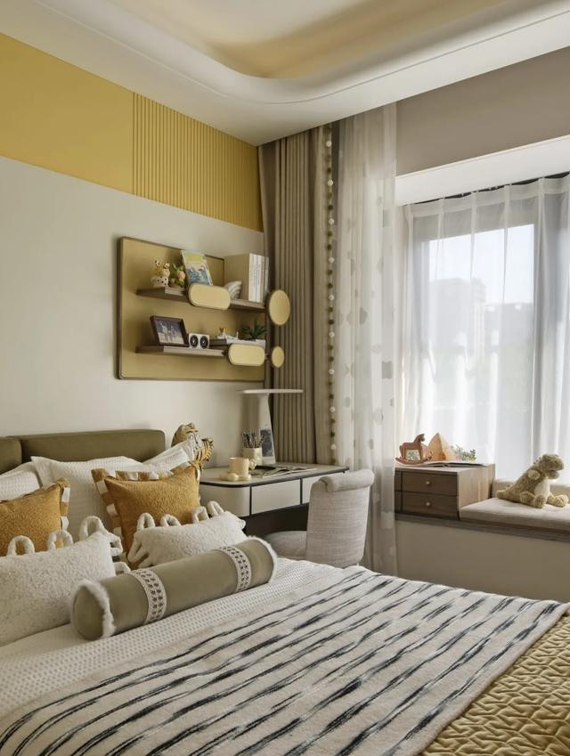 明黄软包墙漫溢温暖基调,云朵吊灯垂落柔芒,卡通造型床搭配柠檬黄绒毯,圆弧玩具柜藏满童趣,织就萌趣盎然的成长小窝。