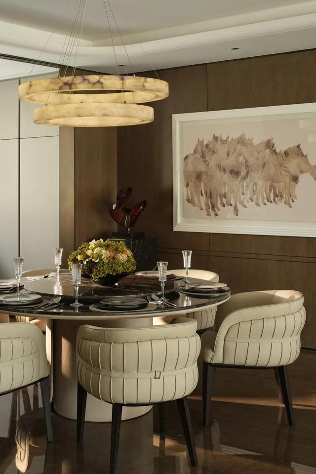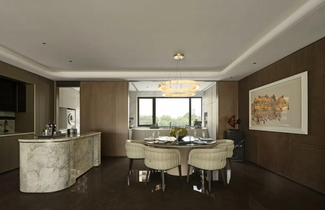 静奢餐厅以大理石餐桌为核,皮质餐椅与雀眼色木饰面和鸣。云石吊灯如星垂落,暖光漫过餐具,窗外城景入席,暮色里,每餐都是舌尖与光影的温柔叙事。