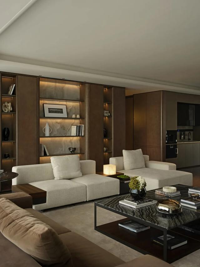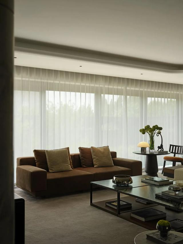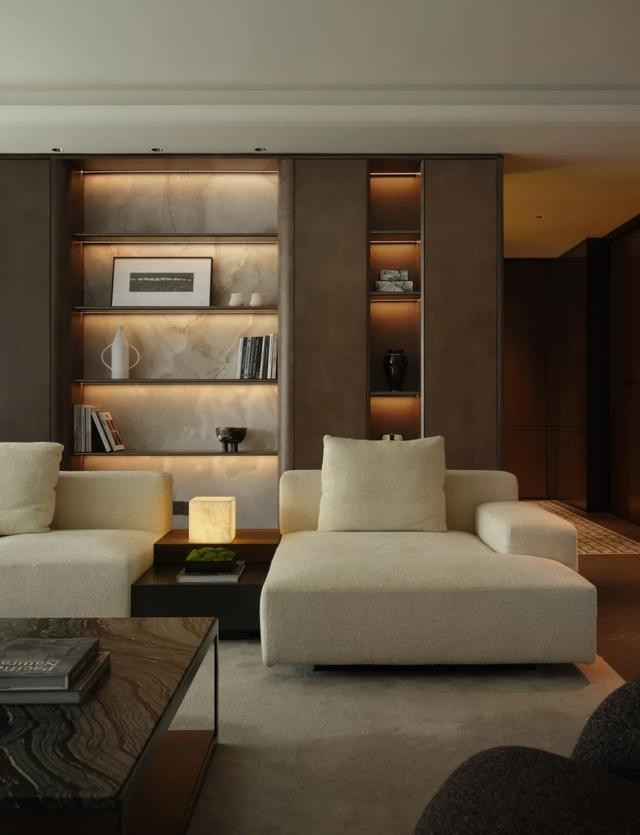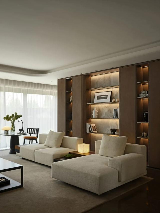 客厅以静奢为骨,低奢家具与雀眼色展示柜共舞,玉石隔板漫透温润雅韵。落地窗如时空画轴,收尽金陵晨昏烟水,光影在材质肌理间游走,织就人文与自然共栖的诗意剧场。