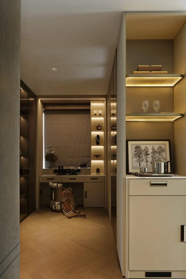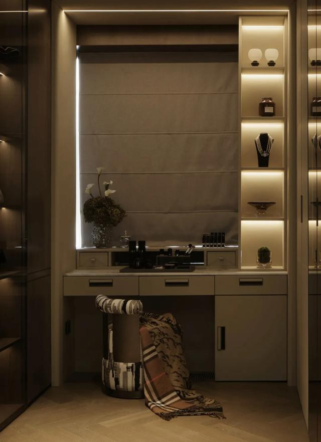 ◎衣帽间来自图森 TUCSON定制,玻璃展柜流淌柔光,衣饰于光影中舒展格调诗篇。