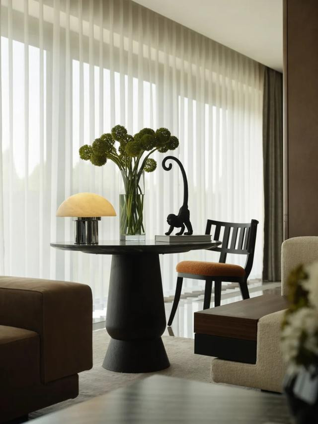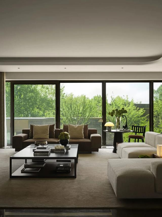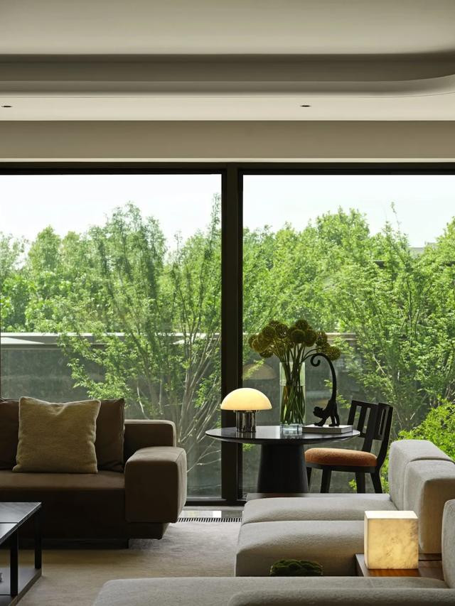 低奢磨砂真皮沙发配大理石茶几,绒面单椅添灵动感。落地窗如巨幅画卷,纳金陵四季光影与城景,于静谧中流淌艺术雅韵。