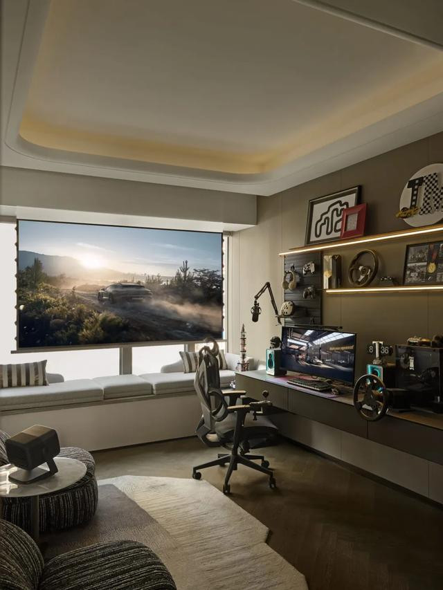 X空间电竞房以黑银柜体展科技感,可升降台随战起伏,侧墙幕布隐现,秒切观影模式,竞影双享。
