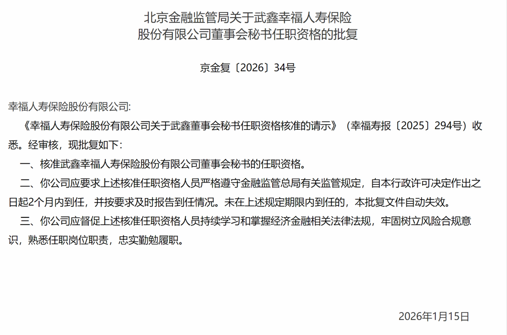 1月23日,北京金融监管局发布关于武鑫幸福人寿保险股份有限公司董事会秘书任职资格的批复,核准武鑫幸福人寿保险股份有限公司董事会秘书的任职资格。